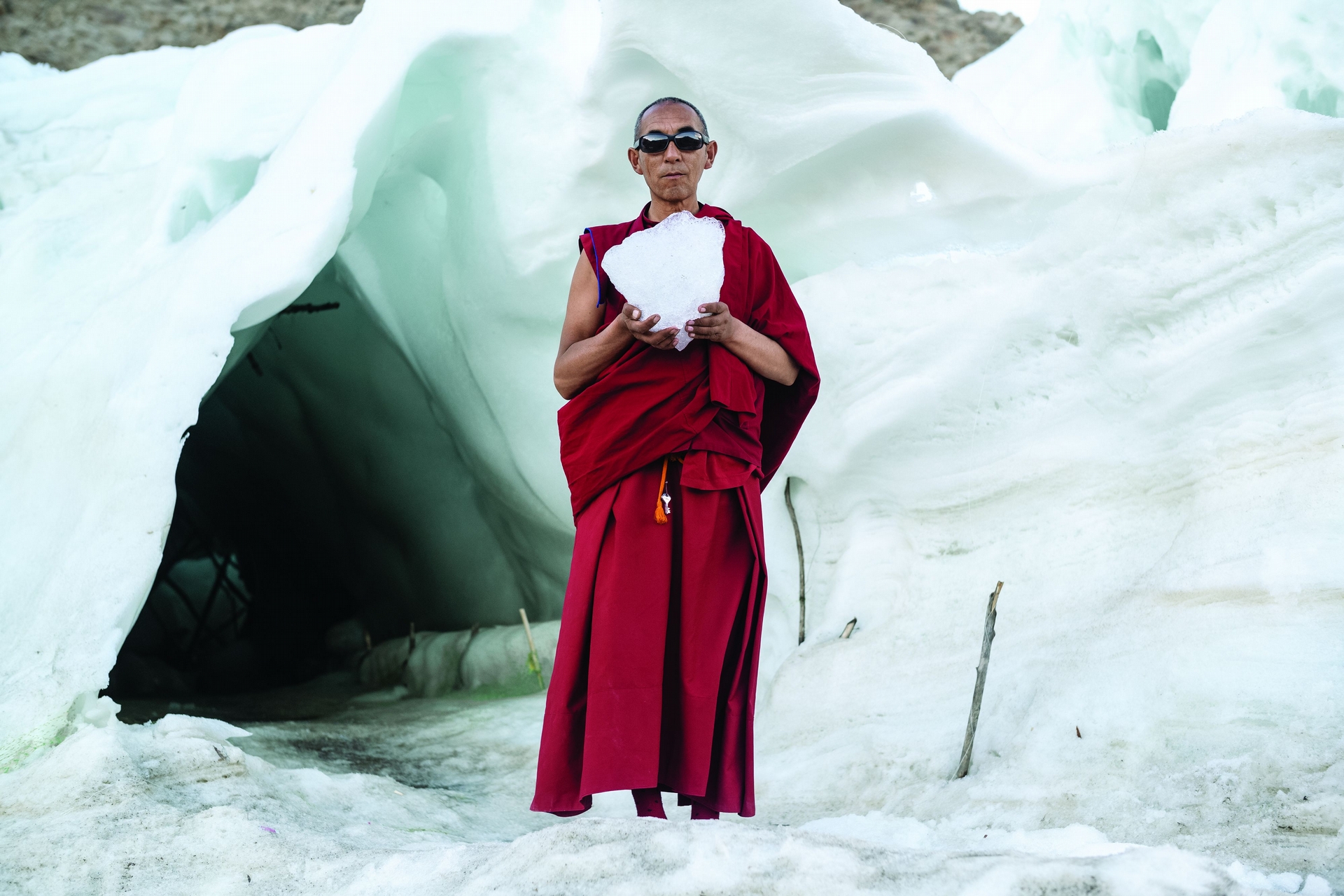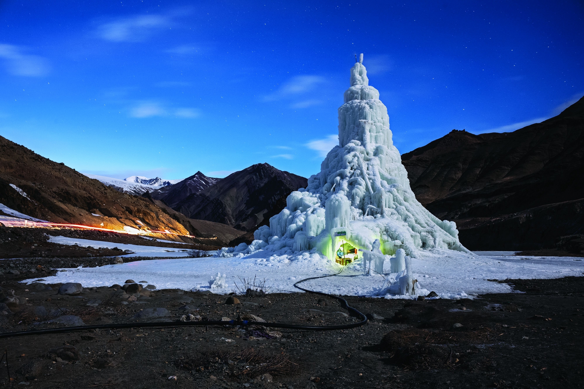 圓錐形冰佛塔的作用就像水塔,可以儲存冬季的融冰以供春耕之用。在印度北部的吉雅村蓋出這座冰佛塔的青年團體,也在塔底開了一間咖啡店。他們用咖啡店的營收帶村裡的長者去朝聖。「沒人帶他們出去走走。」其中一位青年說。 PHOTO: 攝影:西里爾.賈茲貝克 CIRIL JAZBEC