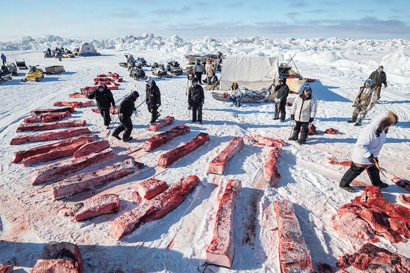 弓頭鯨已經適應了極度寒冷的海水。在這些鯨魚每年穿越楚科奇海與波福海的遷徙中,牠們曾被觀察到為了製造呼吸空間而打破大約半公尺厚的冰層。攝影:奇里. 育延