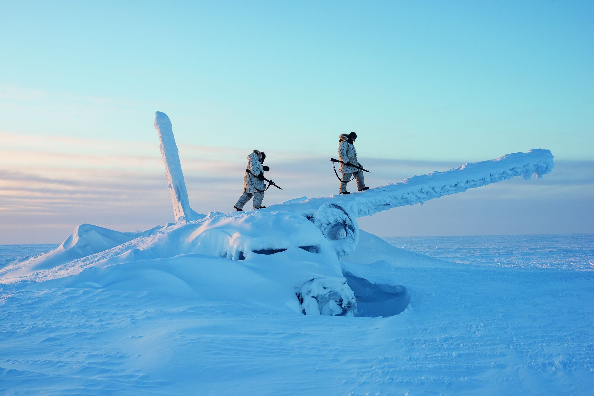 加拿大士兵爬上一架飛機的殘骸偵查這個區域,地點在北極點以南約1600公里的康瓦力島上,他們正在該島接受極地生存訓練。隨著北極地區暖化和環繞該地區未來的緊張情勢升高,加拿大和美國軍方已強化在該地區的軍事行動。攝影:路易.帕盧 LOUIE PALU
