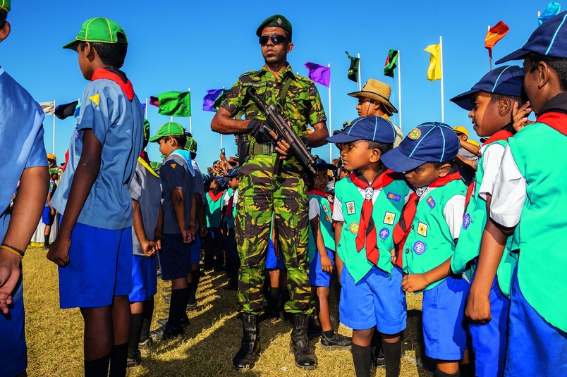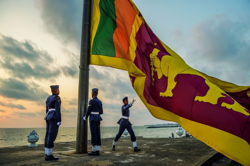 在可倫波相當受歡迎的一座公園——加勒菲斯格林綠地,軍隊的護旗手降下國旗。這座斯里蘭卡最大的城市,幾乎看不出那場分化了僧伽羅人與坦米爾人長達26年的衝突所留下的任何跡象。攝影:艾美.維泰爾 Ami Vitale