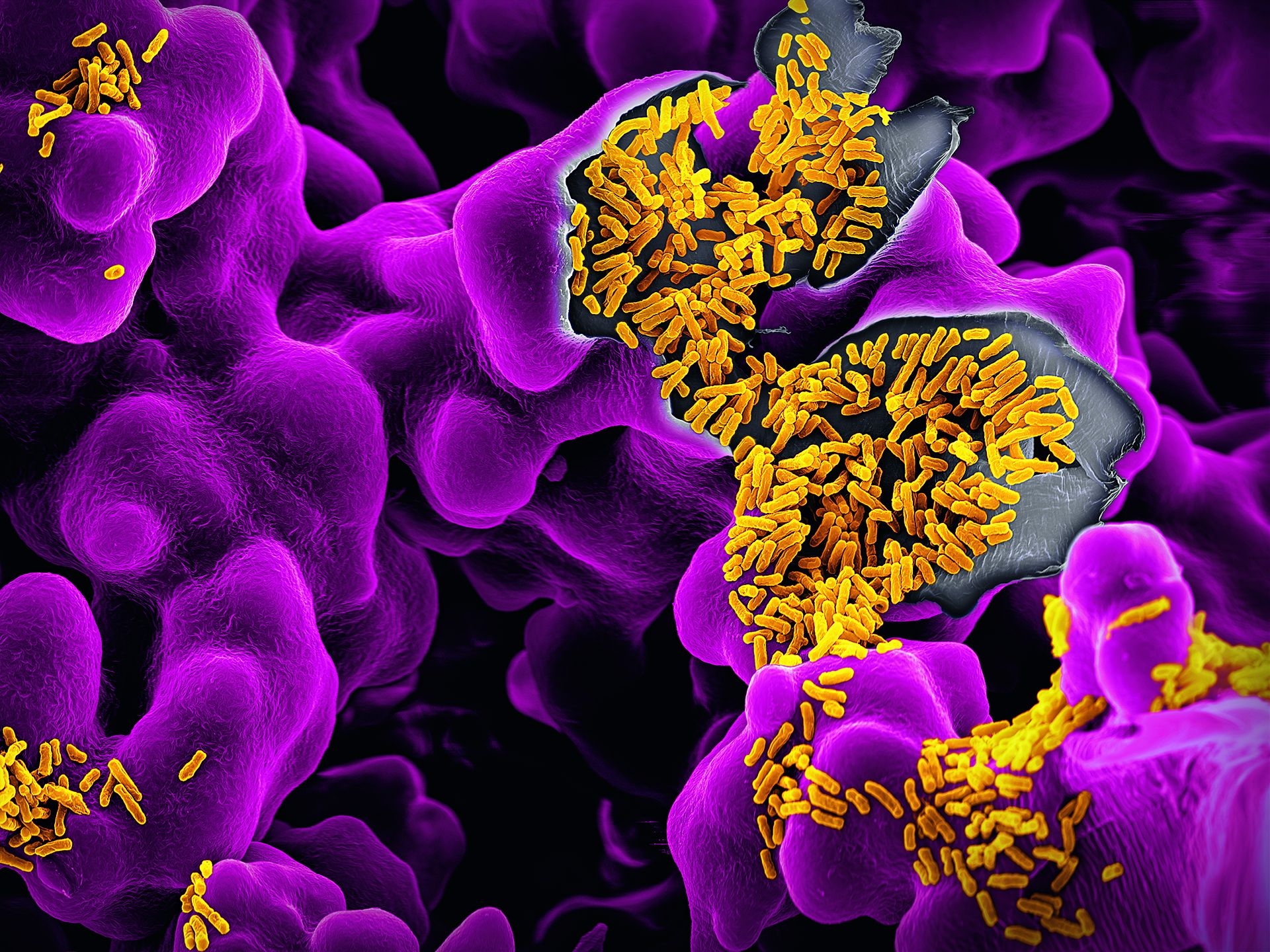 聚集在紫色基質上的黃色短棒狀大腸桿菌(Escheri-chia coli)可造成食物中毒,但多數菌株不僅無害而且還有益。大腸桿菌棲息於人類腸道,負責重要功能,像是製造維生素K和B12,以及防止致病性細菌的生長。影像:馬汀.奧格利 MARTIN OEGGERLI