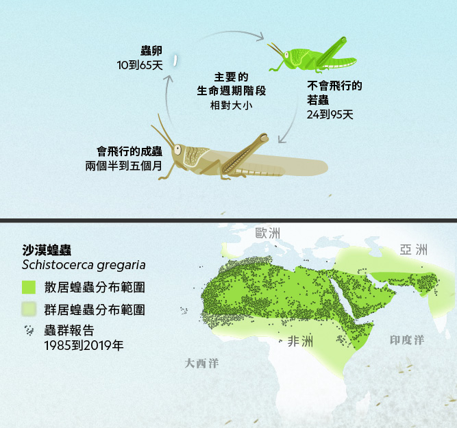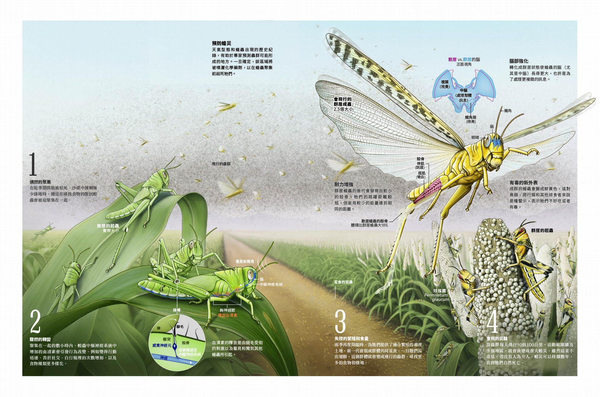 繪圖:泰勒.馬吉雅柯莫。RILEY D. CHAMPINE, NGM STAFF. SOURCES: STEPHEN ROGERS, UNIVERSITY OF CAMBRIDGE; STEPHEN J. SIMPSON, UNIVERSITY OF SYDNEY; KEITH CRESSMAN, FAO DESERT LOCUST INFORMATION SERVICE