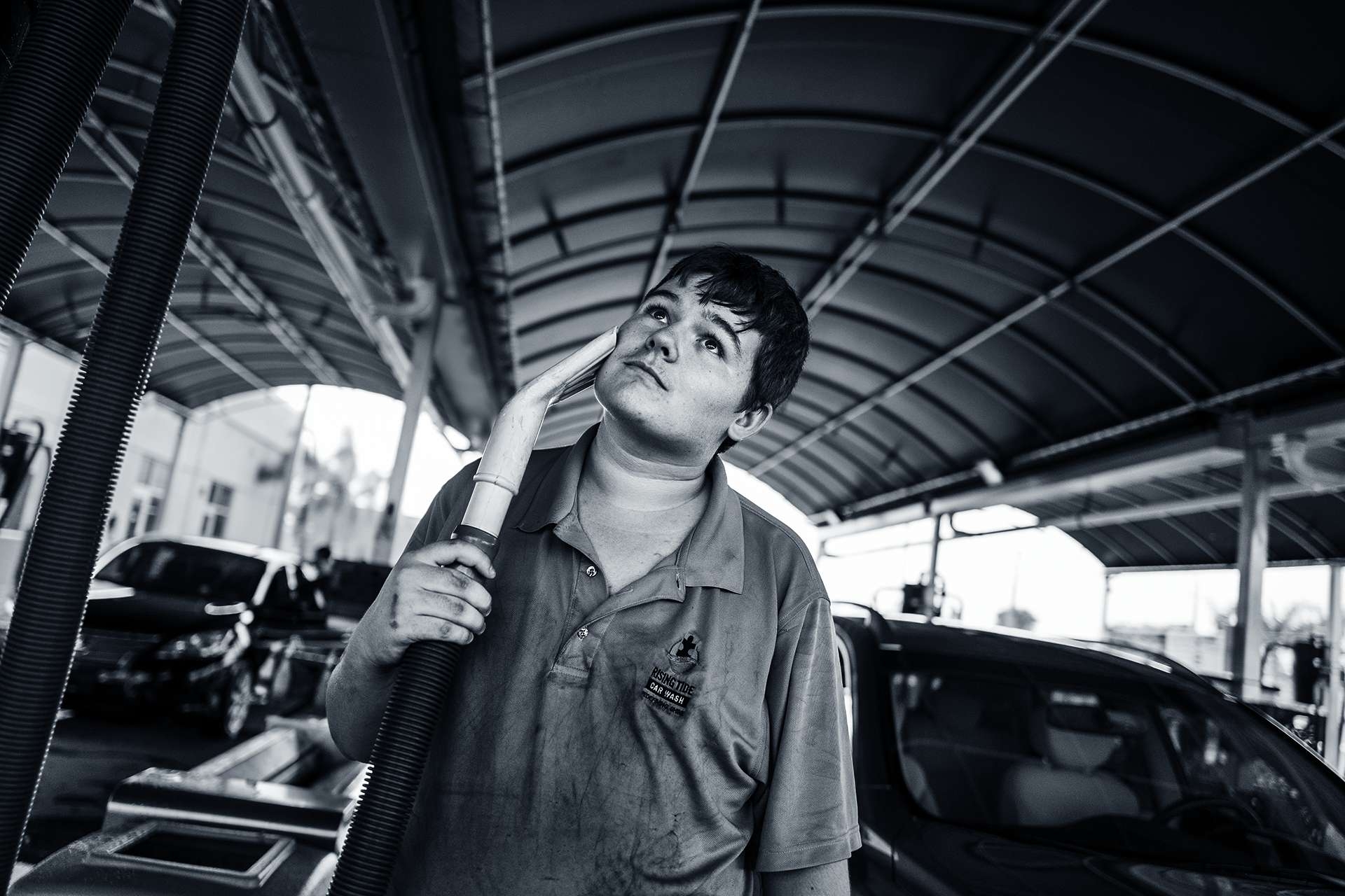 在佛羅里達州馬蓋特市的「漲潮洗車」,19歲的路克.贊達用吸塵器的吸嘴輕撫臉頰。湯姆.德瑞與他的父親開創了這家公司,並僱用他的弟弟與其他自閉症人士。協助自閉症成人找工作的家庭企業愈來愈常見。 PHOTO: LYNN JOHNSON