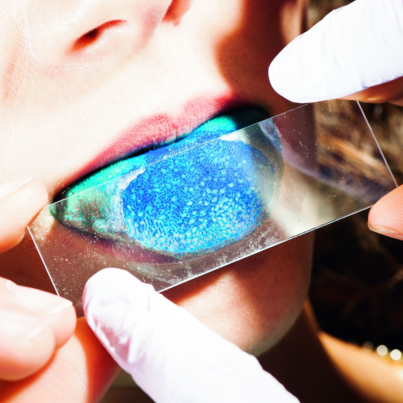 味覺是化學。味覺始於食物分子接觸到舌頭上微小味蕾的那一刻。味蕾藏身於乳突中,也就是圖中以藍色食用色素突顯的淡色小點。味覺在大腦中與其他感覺結合,變成讓我們渴望吃東西的那種豐富、個人而愉悅的體驗。攝影:布萊恩.芬克 Brian Finke