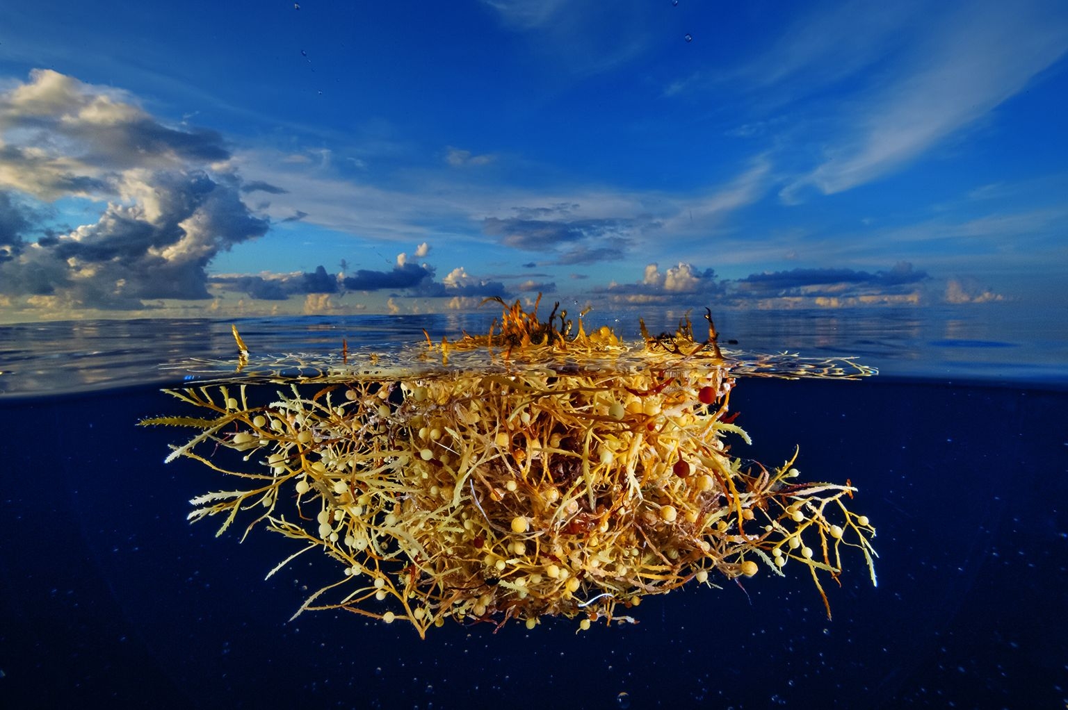 一團足球大小的馬尾藻漂浮在百慕達附近的馬尾藻海緩慢渦流中,馬尾藻海是北大西洋環流的一部分。這麼小的馬尾藻團,也可能有數以千計的海洋生物生活其中,從仔魚到海馬都有。攝影:大衛.都必烈 DAVID DOUBILET