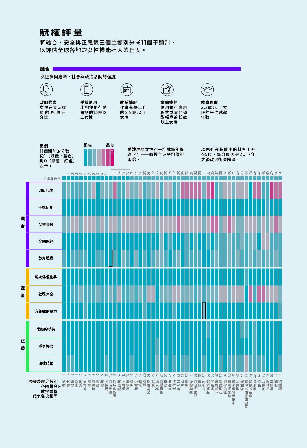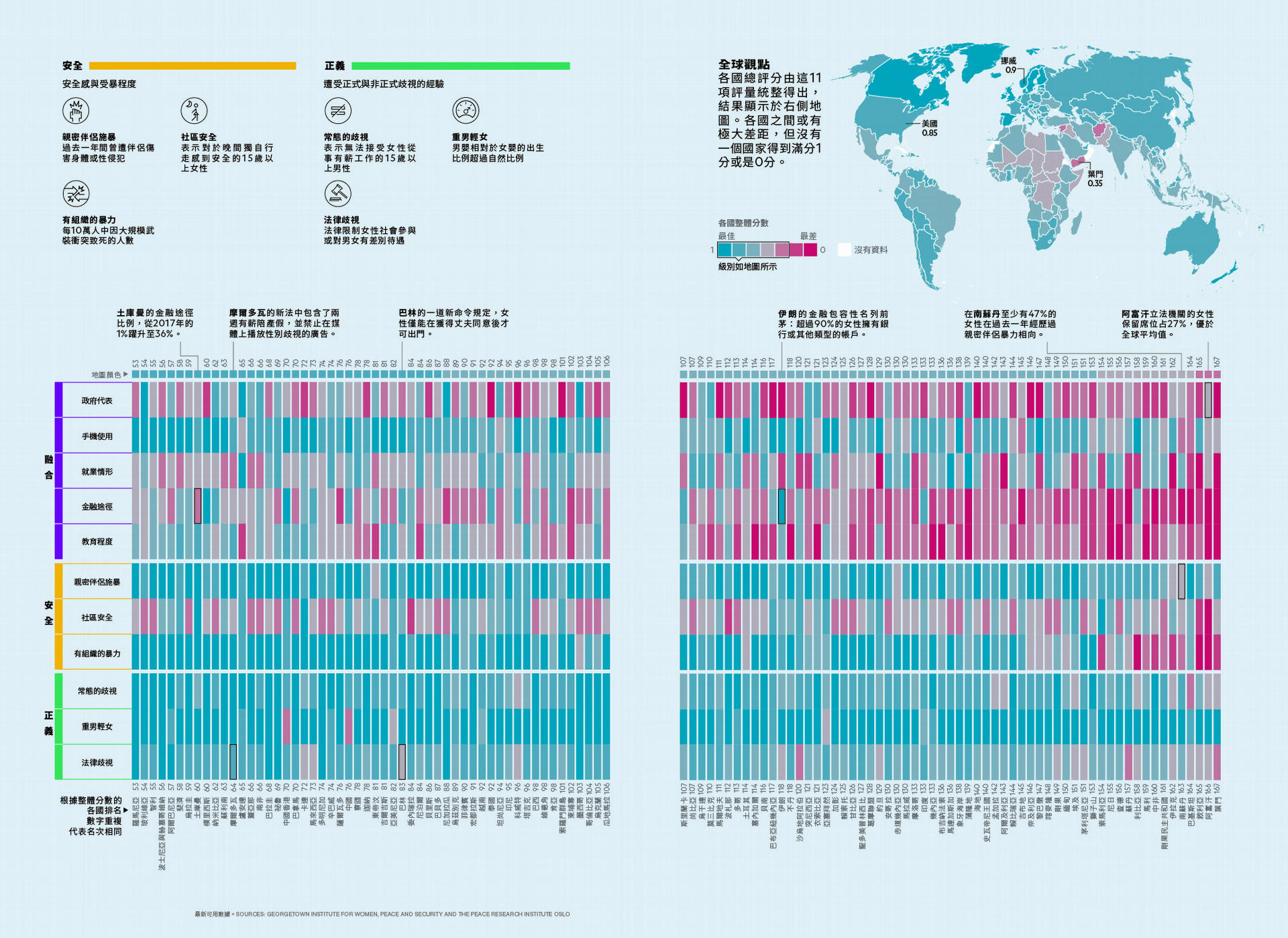 賦權評量|將融合、安全與正義這三個主類別分成11個子類別,以評估全球各地的女性權能壯大的程度。最新可用數據。SOURCES: GEORGETOWN INSTITUTE FOR WOMEN, PEACE AND SECURITY AND THE PEACE RESEARCH INSTITUTE OSLO.製圖:勞森.帕克、蘿絲瑪麗.沃德利 LAWSONPARKER AND ROSEMARY WARDLEY
