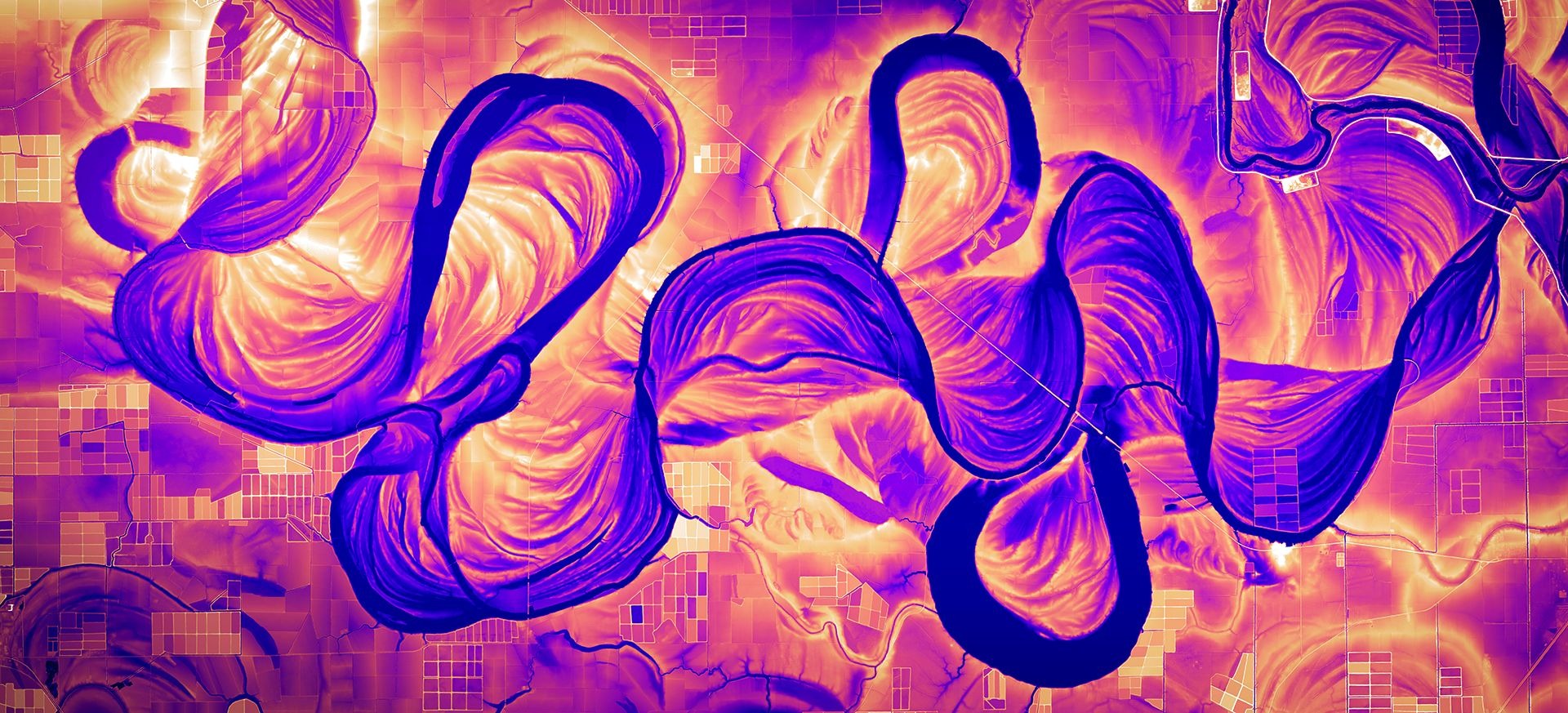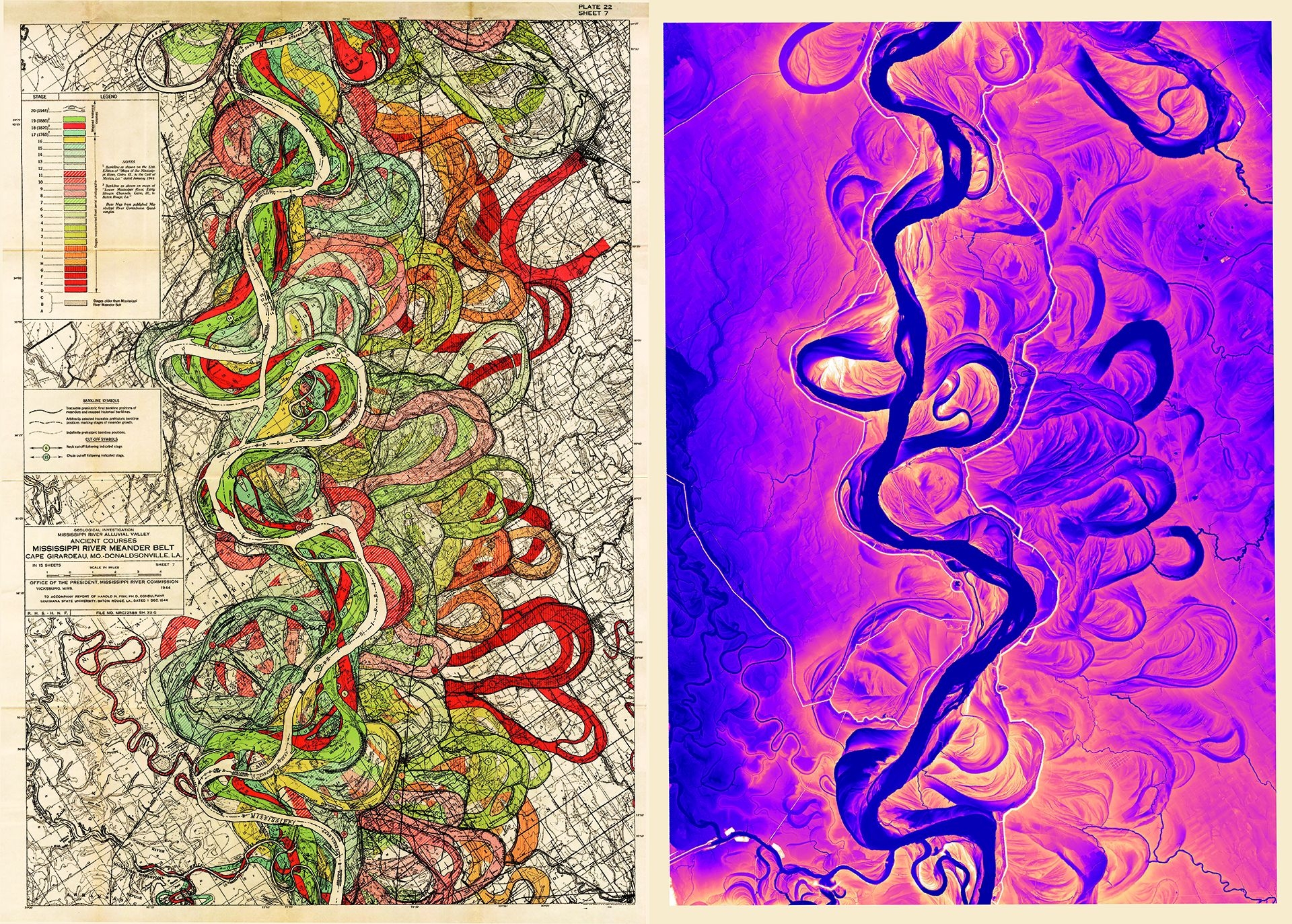 運用名為光達的空照雷射資料製成的生動地圖,展現出密西西比河三角洲的位置與高度。這張圖顯示了密西西比河過去在三個郡上的變動,以及河流形狀的變化。攝影:丹尼爾.寇