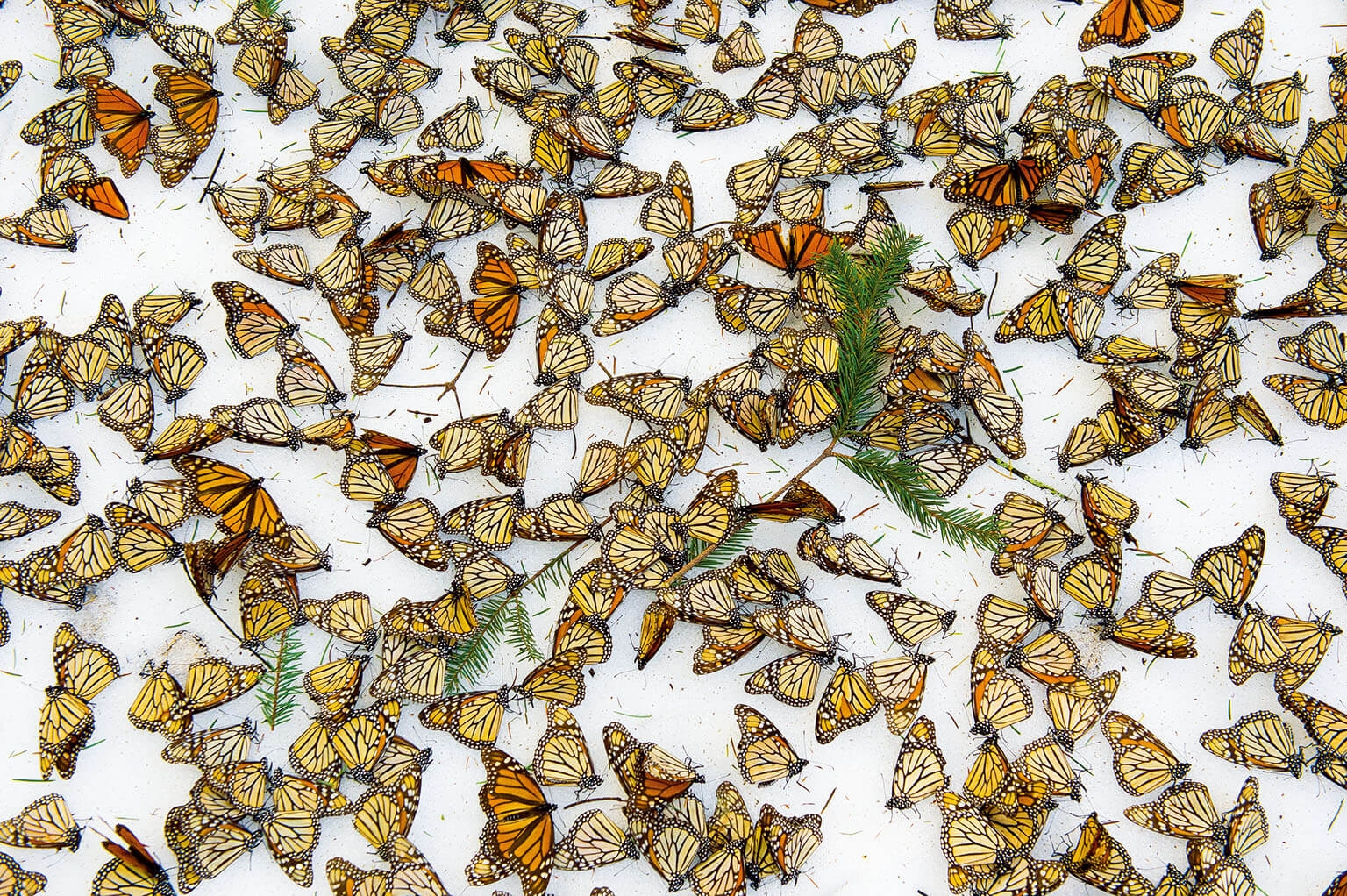 死亡的帝王斑蝶鋪蓋在密卻肯州覆雪的林地上。可能因為氣候變遷而異常強烈的一場春季風暴襲擊了牠們的山中保護區,造成至少900萬隻帝王斑蝶死亡,超過這個群體總數的40%。 PHOTO: JAIME ROJO