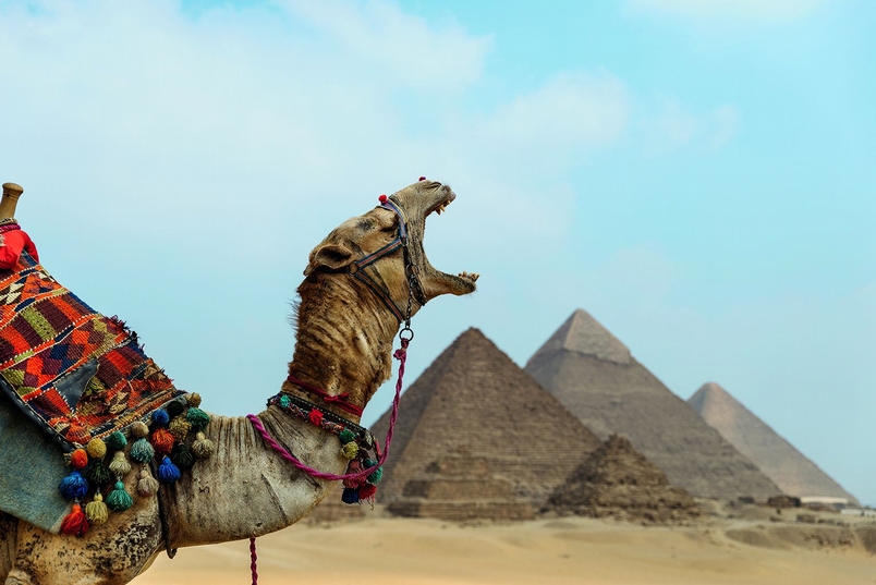 埃及。吉薩金字塔群是世界七大奇觀之一,卻令這匹名叫艾力克斯的駱駝大打呵欠。這片建於4500年前的法老陵墓群是建築創意的奇蹟。其中最大的一座金字塔以230萬個大石塊建成,高147公尺。PHOTO: CLAIRE THOMAS