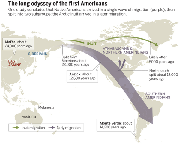 解釋早期美洲移民,更複雜的新劇本如下:兩萬年前起,美洲西北方被冰蓋封路以後,一群人從白令率先由太平洋側沿岸南下,有人一路向南抵達智利,也有人半途轉進內陸,這些向南遷徙的人跟留在北方的人被冰蓋分隔開來,兩邊獨立發展,直到13500年前通道開啟,南北兩群人才有機會再度見面,隨後再陸續南下。