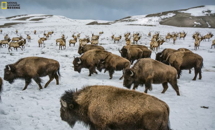 現代黃石公園的美洲野牛,牠們是已經滅絕的草原野牛的親戚。(photograph by Charlie Hamilton James)