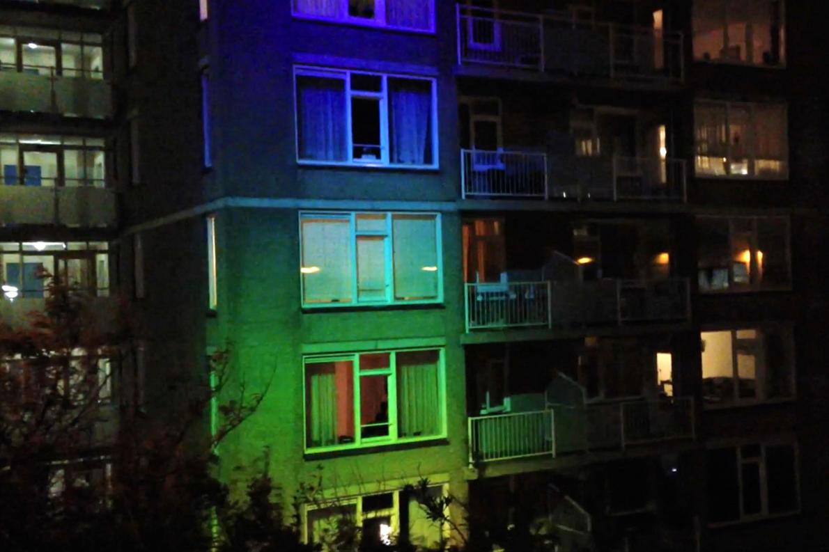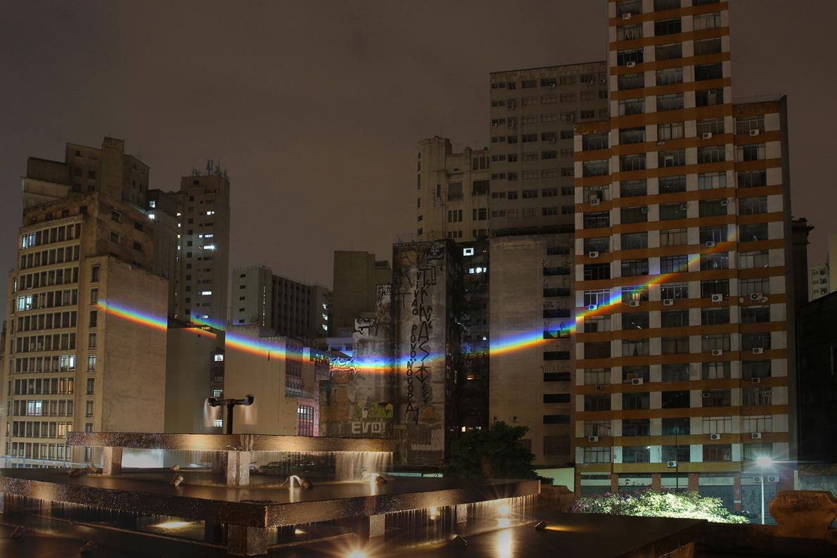 投射在荷蘭恩荷芬「鐘樓」(Klokgebouw)外牆上的彩虹,這是2016年的「天氣不天氣」(Weather or Not)特展的一部分。PHOTOGRAPH BY HANNEKE WETZER