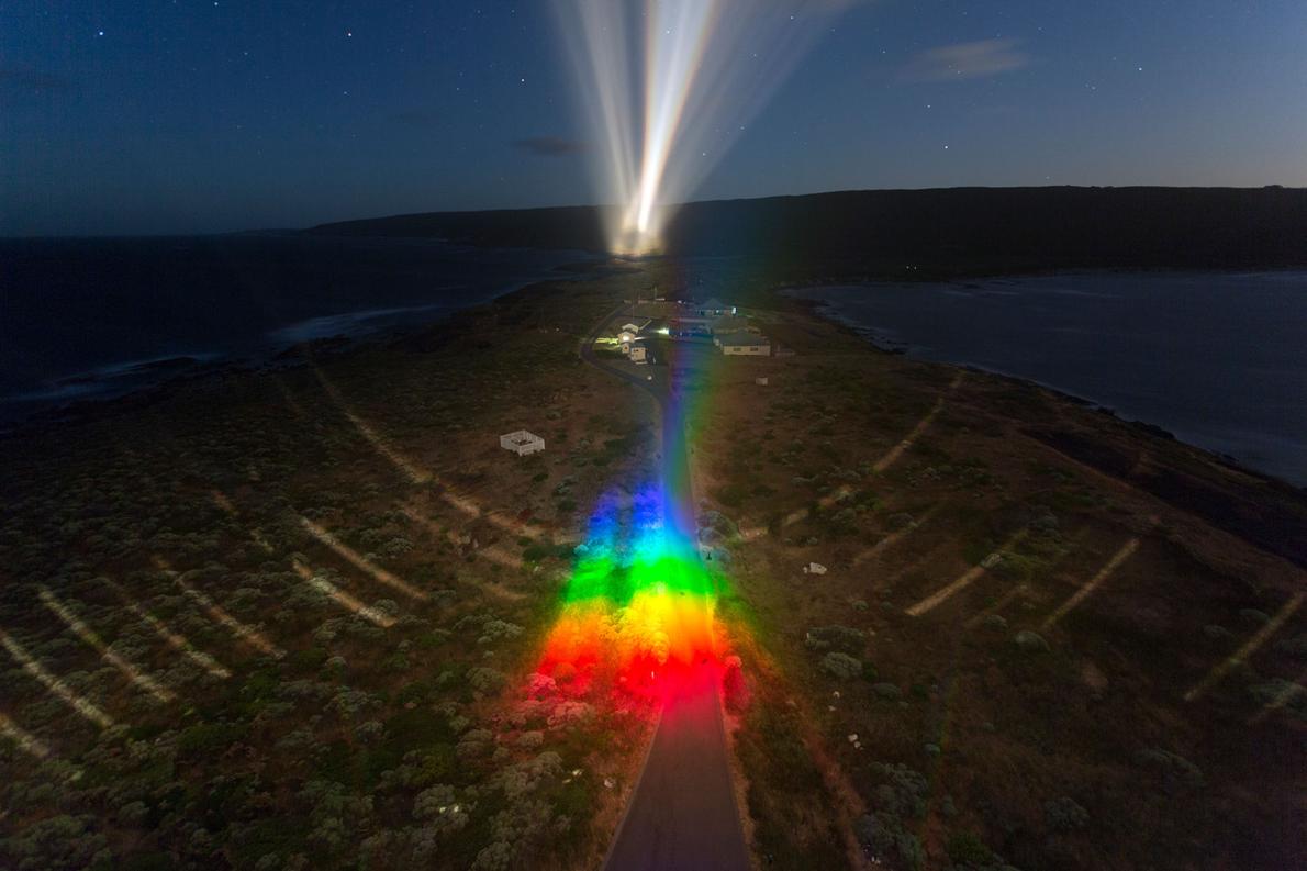 最後他終於說服了澳洲盧文角燈塔的管理團隊,讓他把三稜鏡安裝在燈塔裡那個功率達上千瓦的燈泡前方。他花了整個下午的時間不斷調整。然後,當黃昏降臨,燈泡點亮,彩虹也出現了。每隔七秒半,光線會掃過三稜鏡,把彩虹投射在外面的大地上。