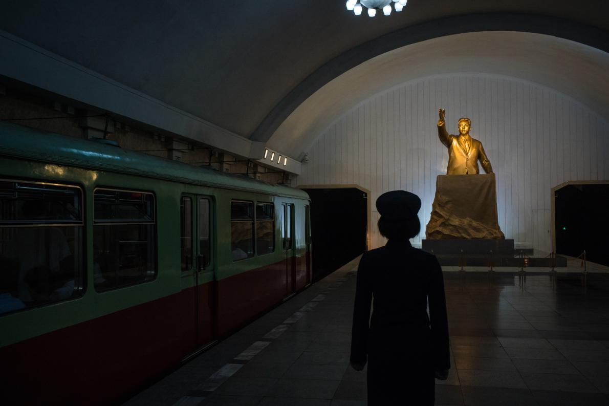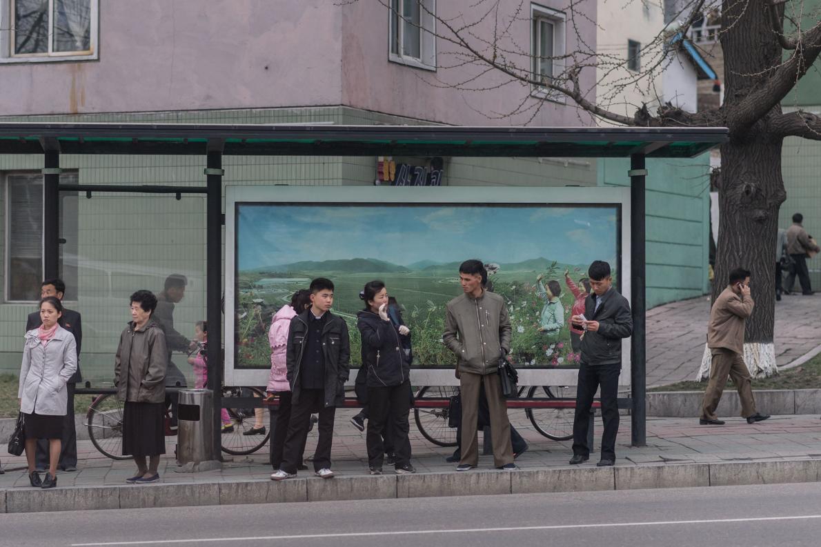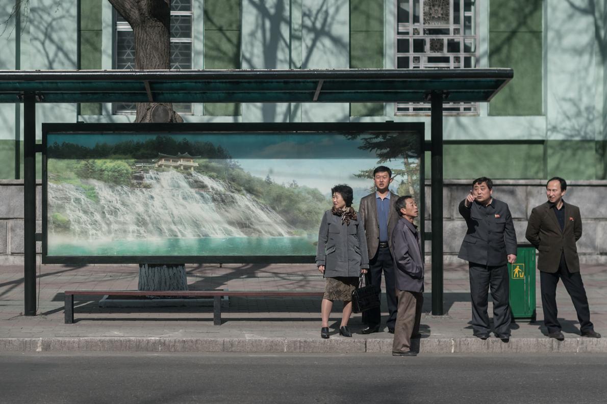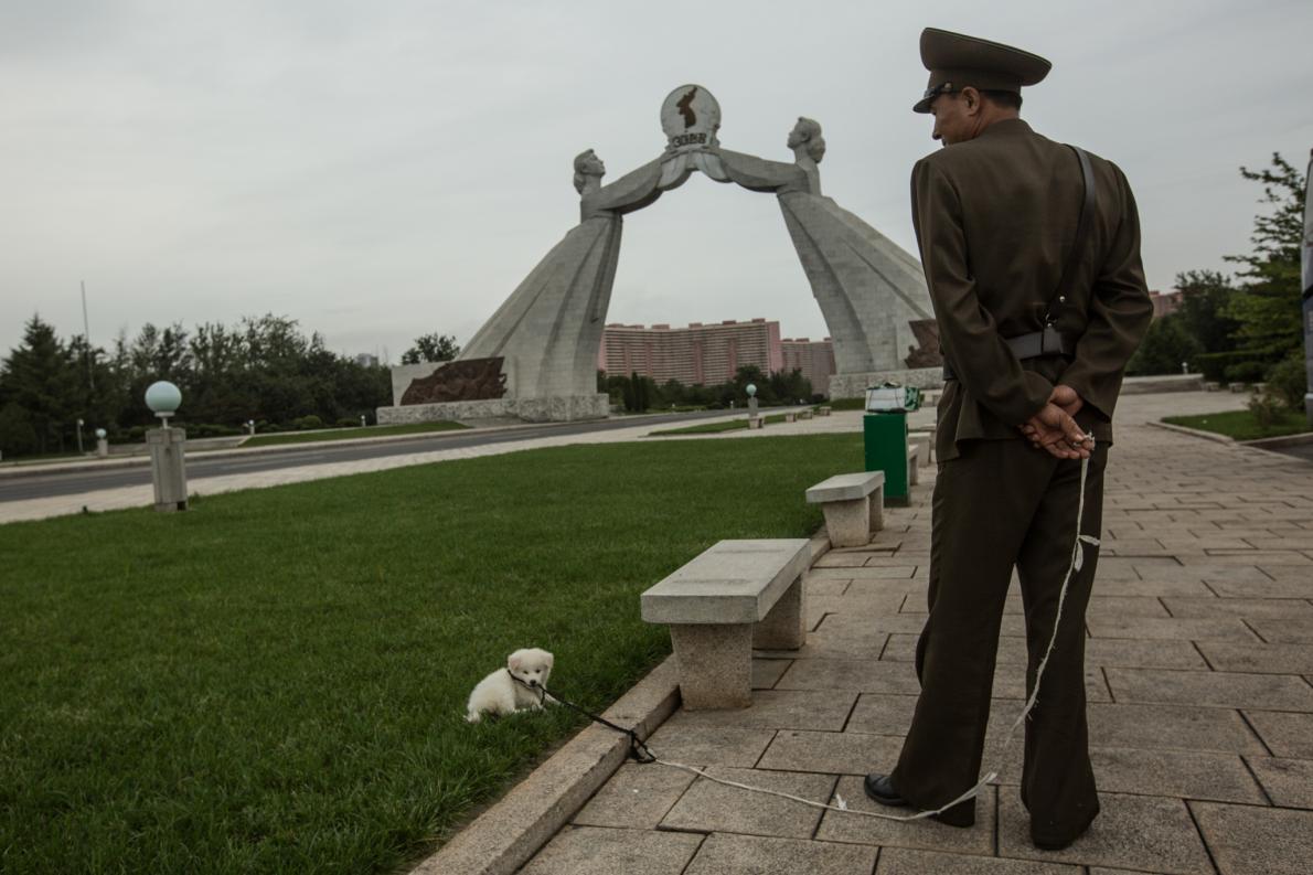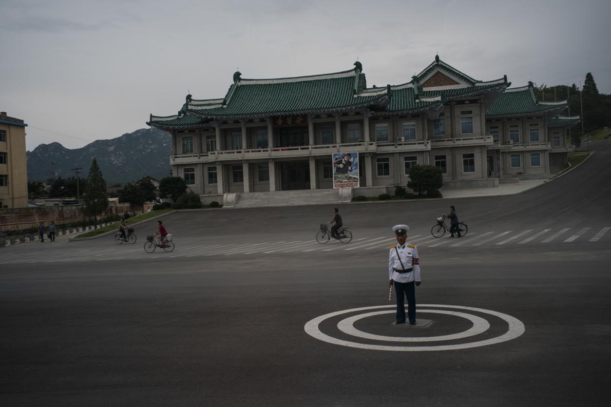 北韓軍人和交通警察(後方藍色制服者)參觀金日成出生地。 PHOTOGRAPH BY DAVID GUTTENFELDER, NATIONAL GEOGRAPHIC CREATIVE, AP