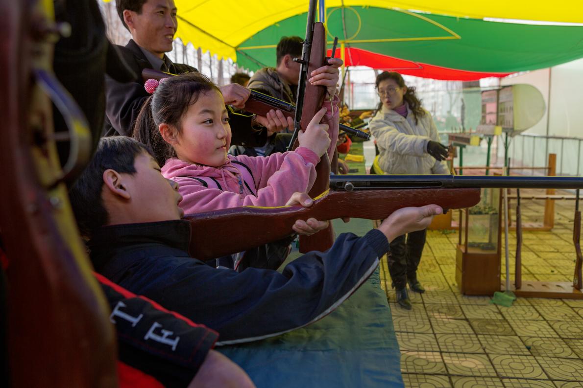 準備好,瞄準⋯⋯:北韓各地的遊戲場都廣受歡迎,照片中的兒童在遊樂場中拿玩具槍。 PHOTOGRAPH BY DAVID GUTTENFELDER, NATIONAL GEOGRAPHIC