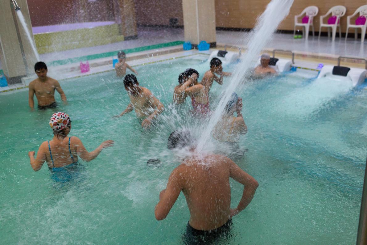 戲水:平壤金日成大學裡的學生上游泳課,享用水注的按摩。 PHOTOGRAPH BY DAVID GUTTENFELDER, NATIONAL GEOGRAPHIC