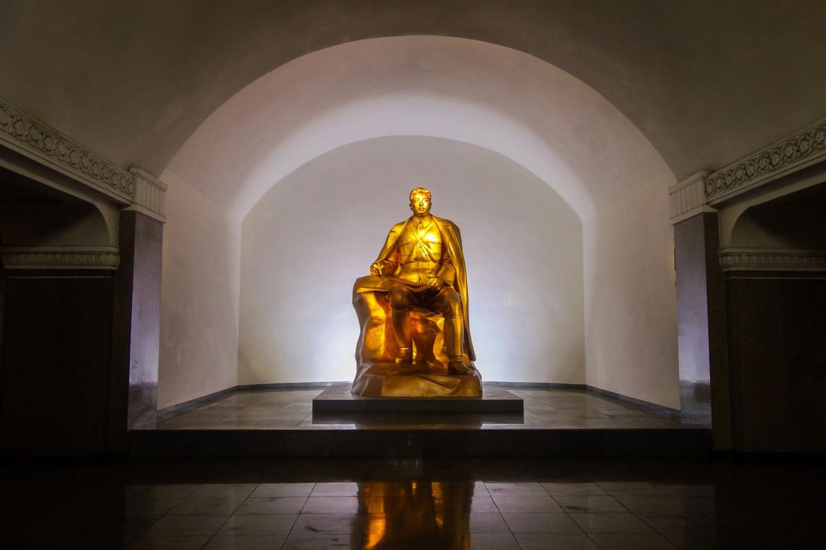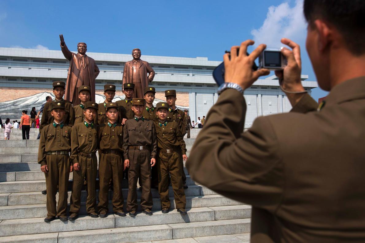 2012年9月9日北韓國慶日,北韓軍人在平壤萬壽台(Mansu Hill)的金日成和金正日銅像前合影。 PHOTOGRAPH BY DAVID GUTTENFELDER, AP