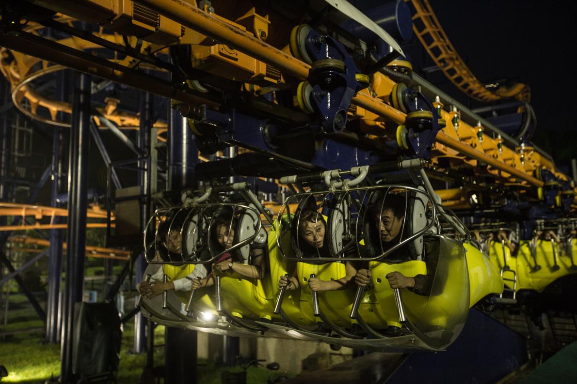 公園與休閒:五顏六色的遊戲設施和單調乏味的公寓大樓成對比。古騰菲爾德說,即使大家的工時長,私人生活又受到嚴格管制,「大家仍然盡量在困境中有享受。」 PHOTOGRAPH BY DAVID GUTTENFELDER, NATIONAL GEOGRAPHIC