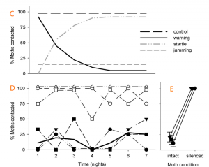 C驚嚇假說、干擾假說與警戒假說所預期的蝙蝠掠食-時間趨勢圖。警戒音(waring):蝙蝠學到警界音與毒性的關係,曲線漸降;驚嚇(startle):蝙蝠習慣驚嚇,曲線漸升;干擾(jamming):蝙蝠回聲定位將被干擾,捕食率不隨時間變動的保持低水平;控制組(control):捕食率不隨時間變動的保持高水平。 D與E干擾假說實驗結果,發聲之葛氏燈蛾(Grote’s bertholdia, Bertholdia trigona )(實心點)的被掠食率顯著低於控制組(空心點),而且人為操作後無法發音的燈蛾之被掠食率顯著上升至與控制組相當的水平(E, intact:完整燈蛾;silenced: 操作後無法發聲之燈蛾)。圖片來源:Corcoran AJ, Barber JR, Conner WE. 2009. Tiger moth jams bat sonar. Science 325:325–27 。