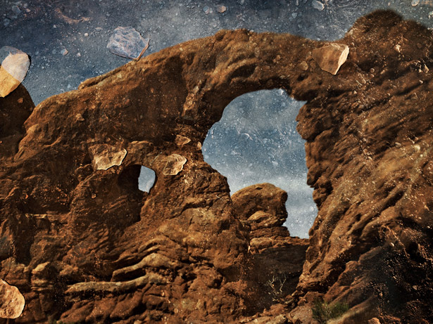 比起這些19世紀的攝影先驅,摩瑞爾幾乎可算是老古董了,他所採用的是已知最早的觀景法之一,也就是針孔相機。甫自麻州藝術與設計學院的攝影學教授職位退休的摩瑞爾,從1990年代起就遵循最基本的光學原理:讓光線透過小孔聚焦在黑暗的表面上。起初他將房間作為反射面,讓房外的街景、摩天大樓、橋梁和田野投射在陰暗的牆面與地上,再以相機捕捉這超寫實的雙重影像。現在摩瑞爾則走到戶外,以土地為反射面,創造出粗糙不平但貼近大地的影像。