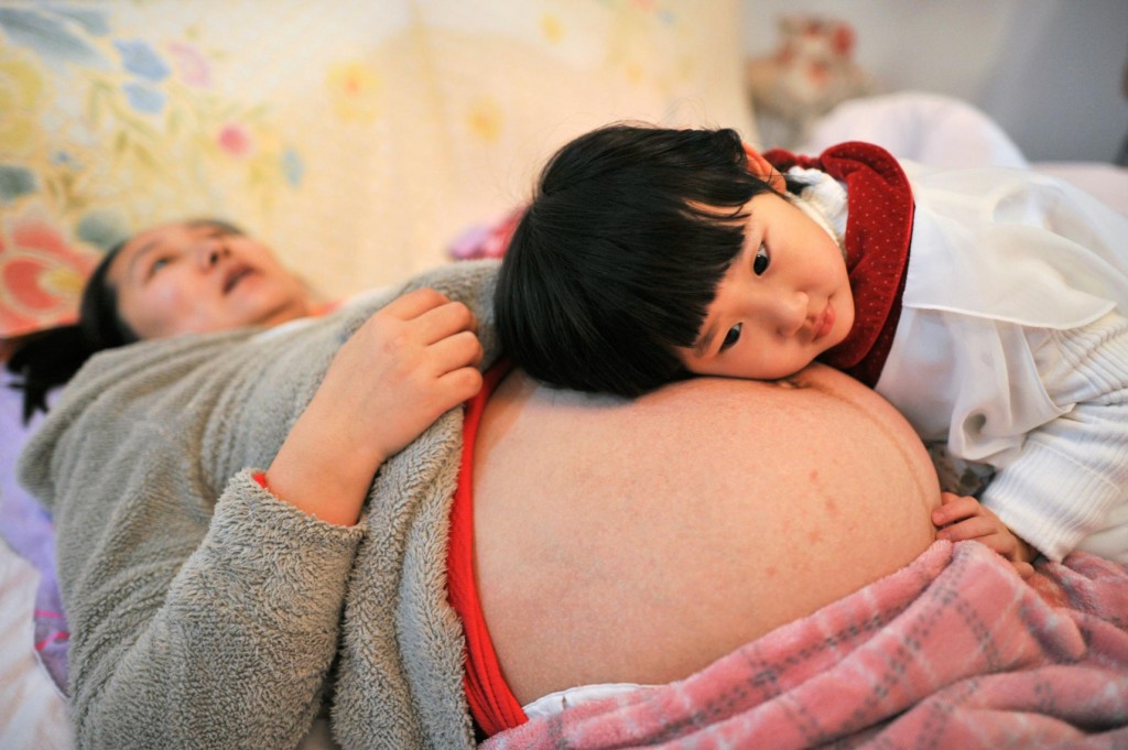 懷著第二胎的李燕(Li Yan,音譯)躺在床上,她的女兒將頭靠在她的肚子上。2013年一胎化政策放寬時,李燕一家是安徽省第一批獲准生第二胎的家庭。 PHOTOGRAPH BY CHINA DAILY, REUTERS