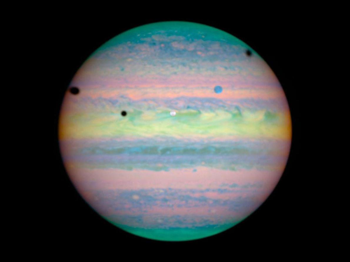 在這張哈伯太空望遠鏡(Hubble Space Telescope)所拍攝的紅外線影像中,木星的三顆大衛星──木衛一埃歐(Io)、木衛三甘尼米德和木衛四卡利斯多(Callisto)在明亮的雲帶前方,看起來就像是黑暗的斑點。 PHOTOGRAPH BY NASA/ESA/E. KARKOSCHKA (UNIVERSITY OF ARIZONA)
