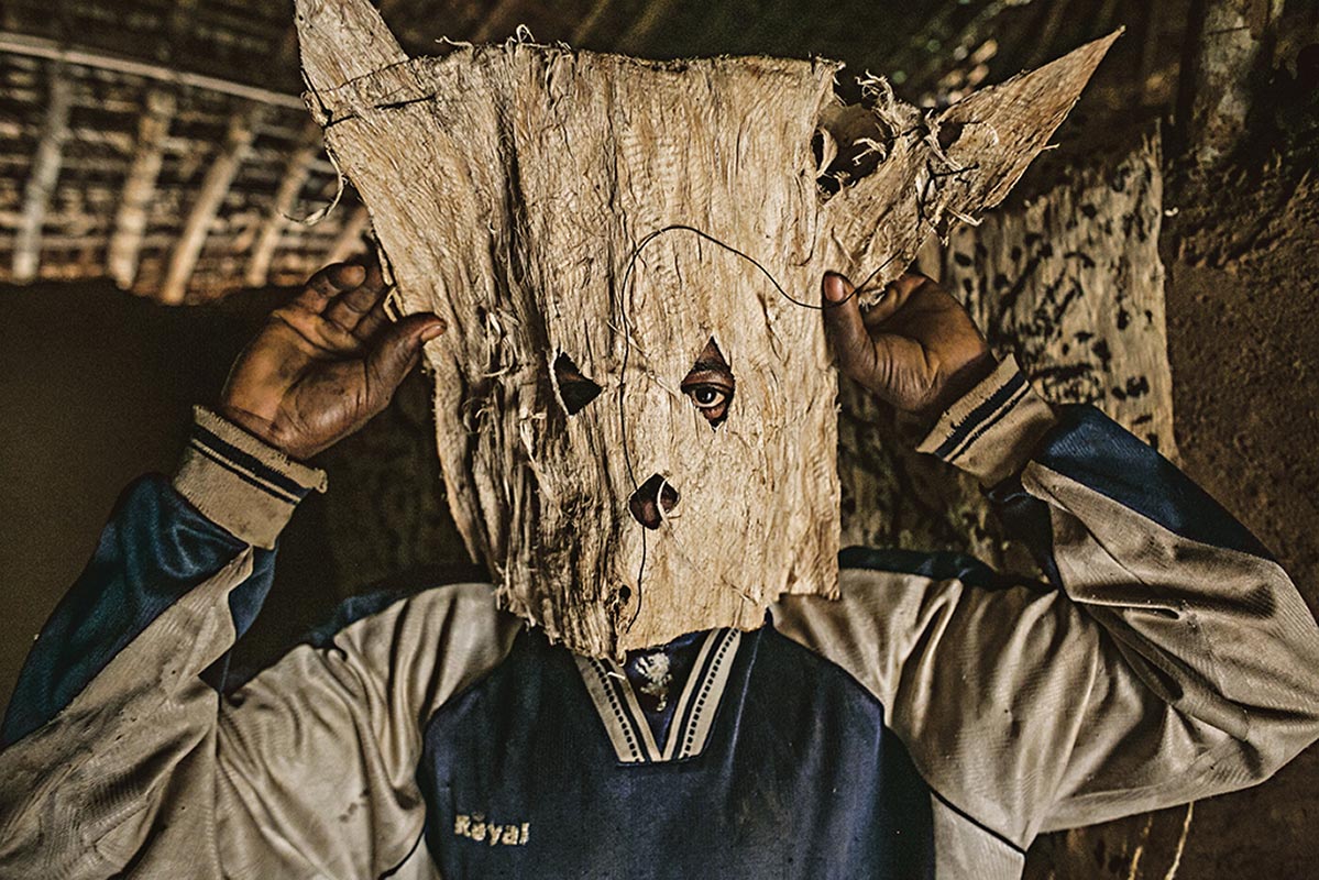 剛果民主共和國一座小村落的獵人調整他追蹤獵物時所要戴的面具。食用受感染的野生動物是伊波拉病毒傳給人類的途徑之一。Photograph by Pete Muller。Photograph by Pete Muller