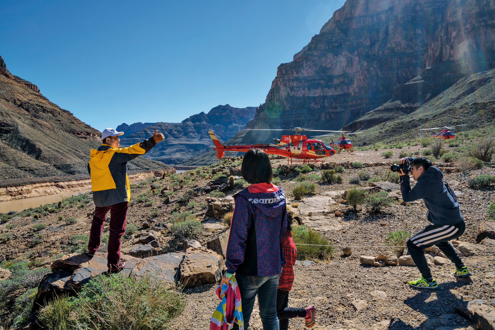 飛覽西峽谷的觀光客攝影留念。2015年,直升機遊覽吸引了超過100萬名遊客造訪瓦拉派族的土地。今年春天,國家地理在稱為「直升機巷」的區域內統計到五個小時內就有262次飛航,生意好時一天可達450次以上。Photograph by Pete McBride