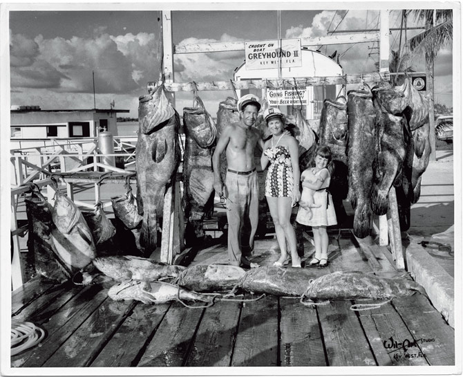 1958年,湯尼.泰拉奇諾船長一家人與他們在佛羅里達群島一天的漁獲合影。休閒漁釣也是將伊氏石斑魚推向滅絕邊緣的因素之一。Photograph by Monroe County Public Library, Florida