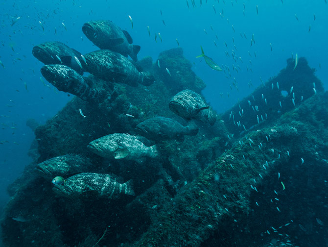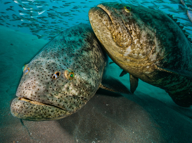 佛羅里達的朱匹特附近,伊氏石斑魚懸浮在名為「錫安列車」的人工礁石上方的強勁海流中。這種魚會以幾十條甚至幾百條的規模聚集在沉船或礁石附近準備產卵。這種行為在每年8、9月的新月期達到高峰,牠們因而很容易被捕獲。Photograph by David Doubilet and Jennifer Hayes