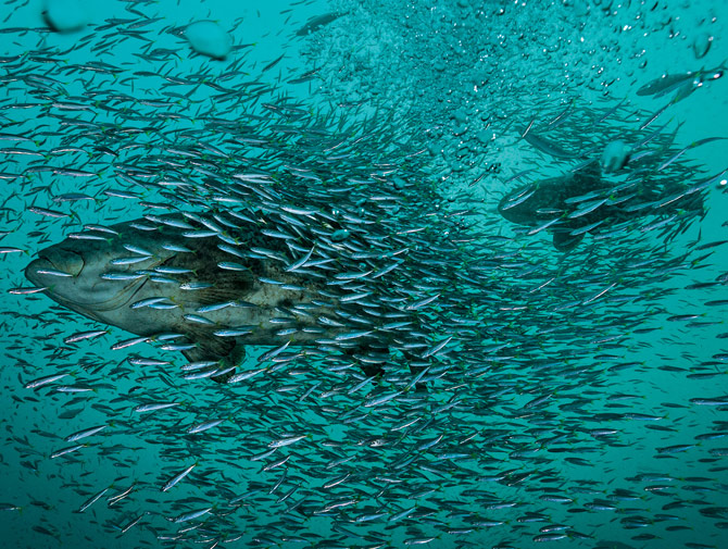 一群小魚圍繞著一條準備與附近的雄魚一起產卵的伊氏石斑魚雌魚。一切就緒之後,牠會在靠近水面的地方釋出數以千計的卵,雄魚則緊接著釋出一片雲霧狀的精子。這時候,群集的小魚會盡可能大啖魚卵,直到海流將魚卵沖散。Photograph by David Doubilet and Jennifer Hayes