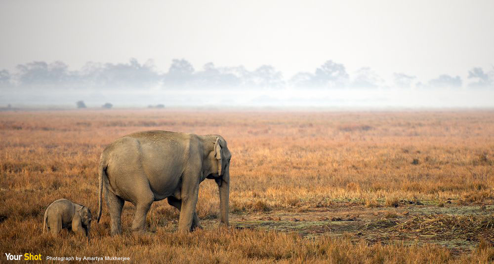 印度象被國際自然保護聯盟列為瀕危物種,照片中的母象領著孩子在清晨走過卡齊蘭加草原,遠處為冬霧籠罩著。牠們在印度東北方正面臨棲地減少、活動範圍縮小、火車撞擊事故等威脅。(本作品來自〈你的觀點〉,同時收錄於每日精選App中20161221圖集。)