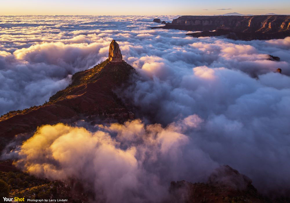 大峽谷北緣出現了特殊氣候,夏末谷底的餘溫碰到第一波冷濕暴風雨,逆溫雲就此形成。大峽谷國家公園最高處──帝王點高度超過2682公尺。而峽谷此時滿溢緩慢移動的雲海,幾乎把海頓山完全隱沒其中。(本作品來自〈你的觀點〉,同時收錄於每日精選App中20170216圖集。)