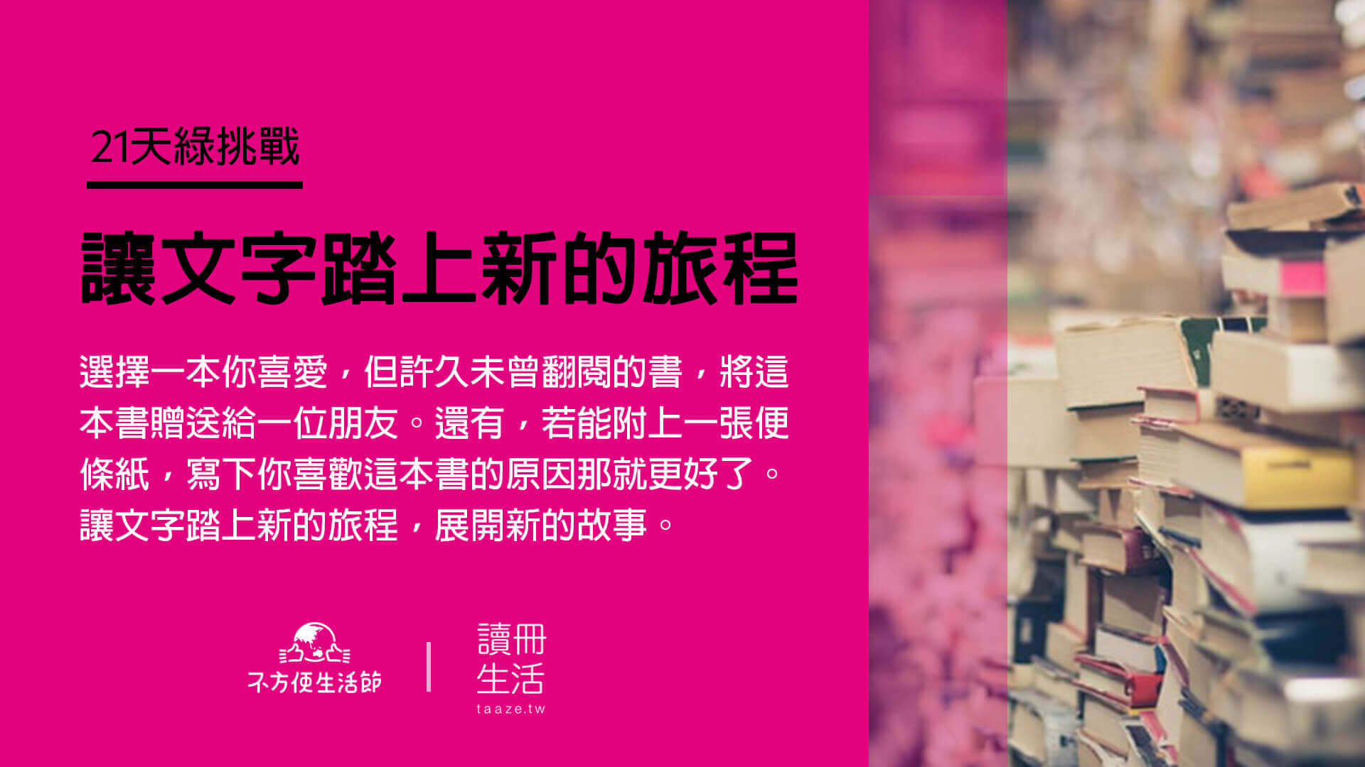 選擇一本你喜愛,但許久未曾翻閱的書,將這本書贈送給一位朋友。還有,若能附上一張便條紙,寫下你喜歡這本書的原因那就更好了。讓文字踏上新的旅程,展開新的故事。