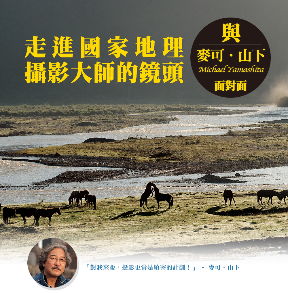 今年4月,麥可.山下(Michael Yamashita)特地來台拍攝媽祖文化特色,計畫於《國家地理》雜誌中文版發表專題報導,同時首度在台中與喜愛國家地理及攝影的粉絲見面,分享多年拍攝經驗與鏡頭背後故事,您將有機會與國際大師近距離學習國家地理攝影師對拍攝任務的縝密規劃與完美堅持,將帶給台灣愛好攝影的朋友許多驚喜,別錯過與大師近距離交流的機會!