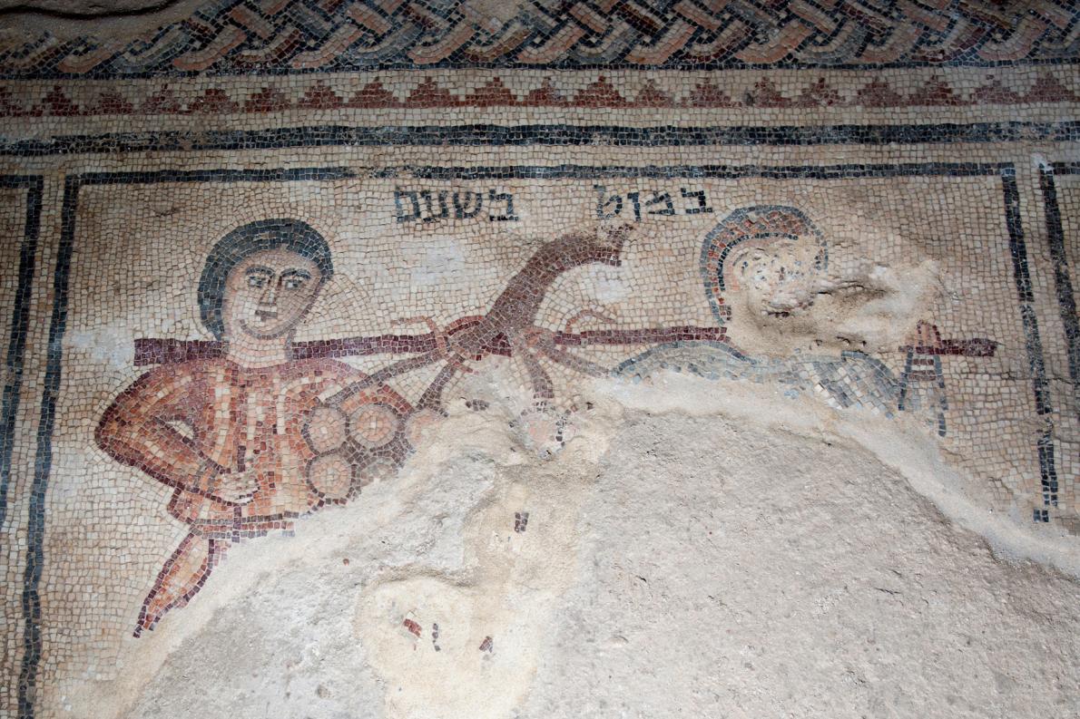 根據北卡羅萊納大學教堂山分校(University of North Carolina-Chapel Hill)7月9日發布的消息,最近在胡科克(Huqoq)進行的猶太會堂發掘調查中,發現了這幅描繪兩名男子以一支竿挑著葡萄的馬賽克。男子上方以希伯來語刻著「兩個人用槓抬著」——這段出自聖經《民數記》(Numbers)13章23節。