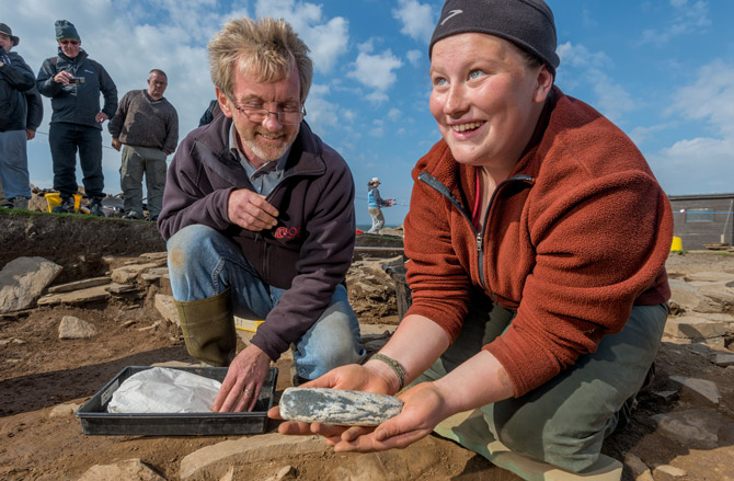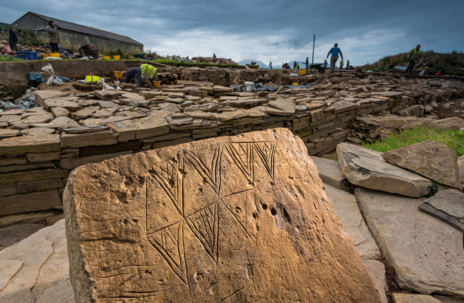 考古學家在發掘布羅德蓋岬遺址時,發現了豐富的新石器時代藝術,這是到目前為止在大不列顛出土的藝術品中最為可觀的一批,包括這塊刻有幾何圖案的裝飾石塊。