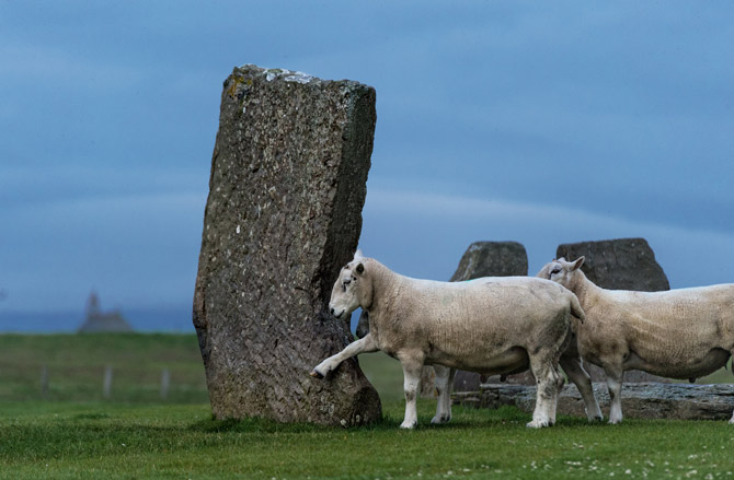 羊群在史坦奈斯立石間吃草,斯通亨治巨石陣可能就是參考這些立石而建造的。1814年曾有一名農人為了便於照料田地而試著移走這些古老的巨石。Photograph by Jim Richardson