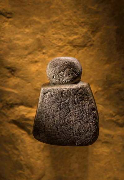 這個骨牌大小的人形石像是在大不列顛發現最古老的人臉圖像。Photograph by Jim Richardson. Links of Noltland artifacts photographed with permission of Historic Scotland