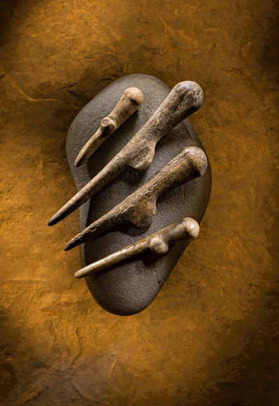 這些以骨頭和鹿角製成、長達18公分的插針可能是用來繫緊長袍。Photograph by Jim Richardson. Links of Noltland artifacts photographed with permission of Historic Scotland