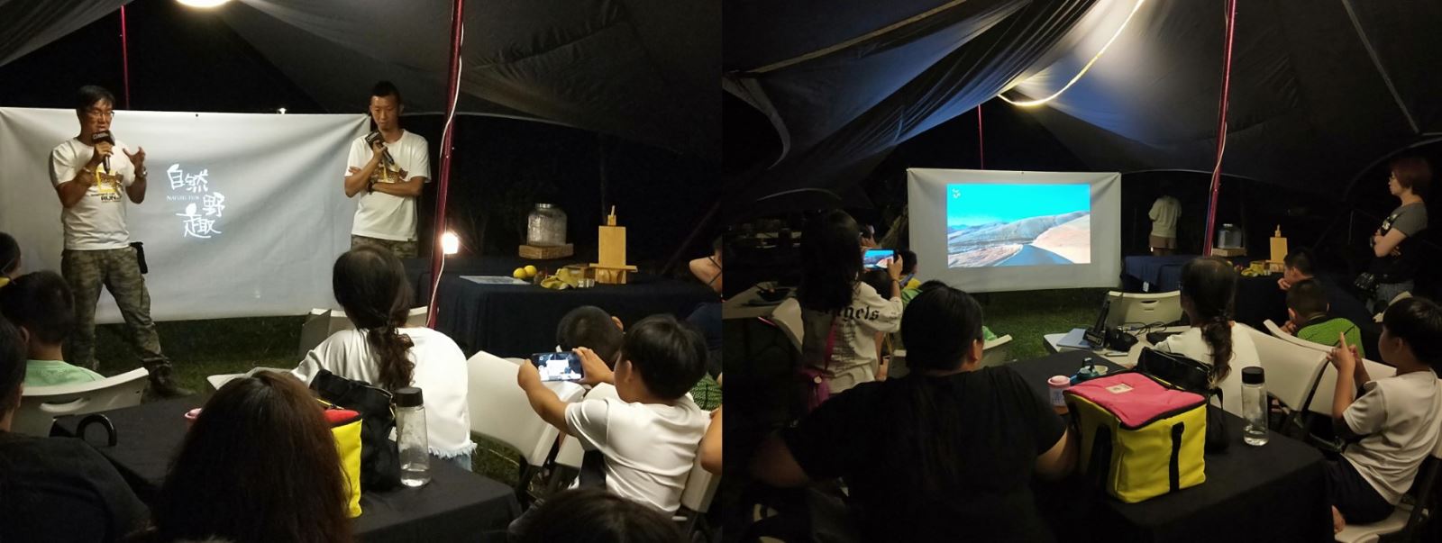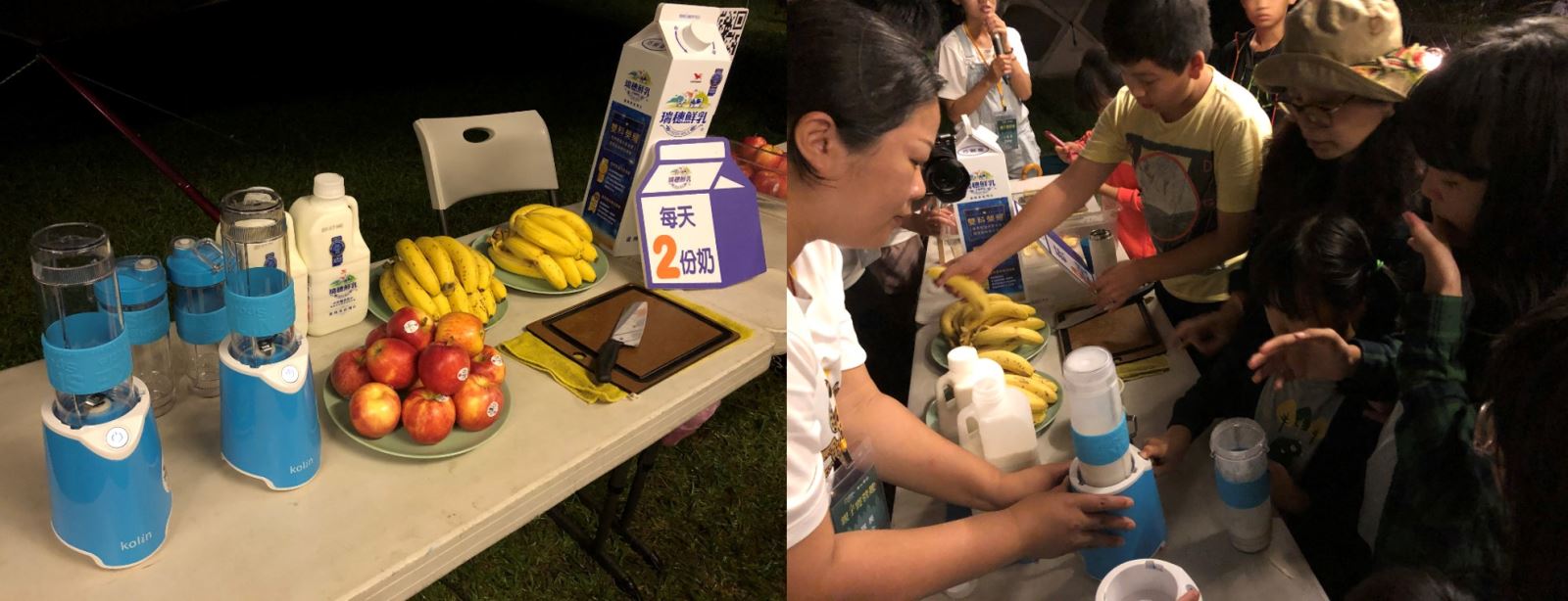 晚餐,除了享用自己製作的前菜與那山那谷精心準備的晚餐,為補充體力用歌林果汁機放入瑞穗鮮乳與新鮮水果,補充營養!豐富的課程告一段落後,伴著雨聲點點,大小朋友坐在營地間看著影片、細細聆聽老師在自然觀察中的學習與分享,為一天畫下句點。
