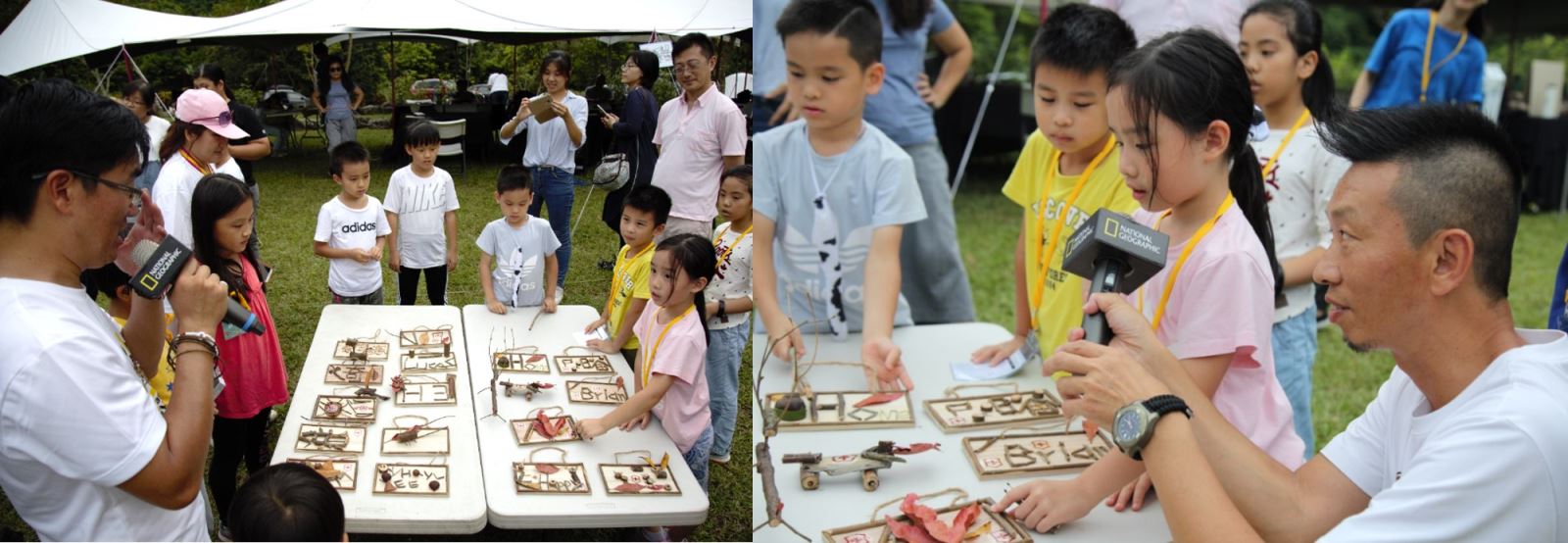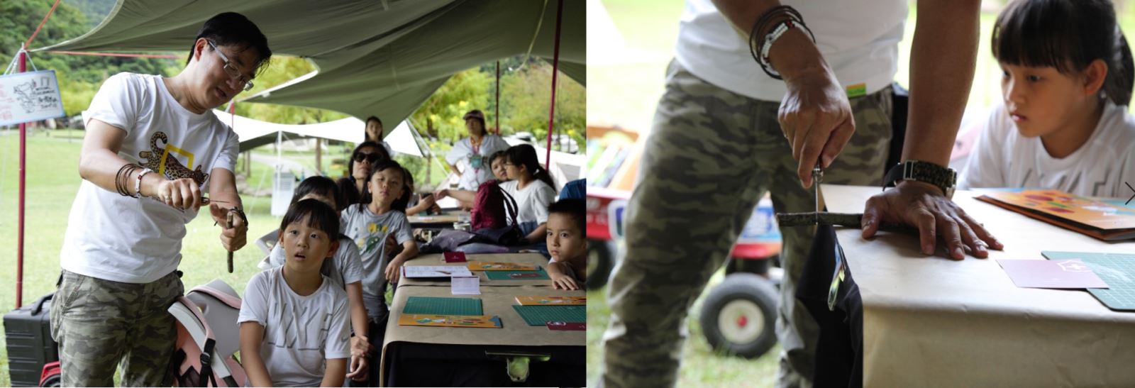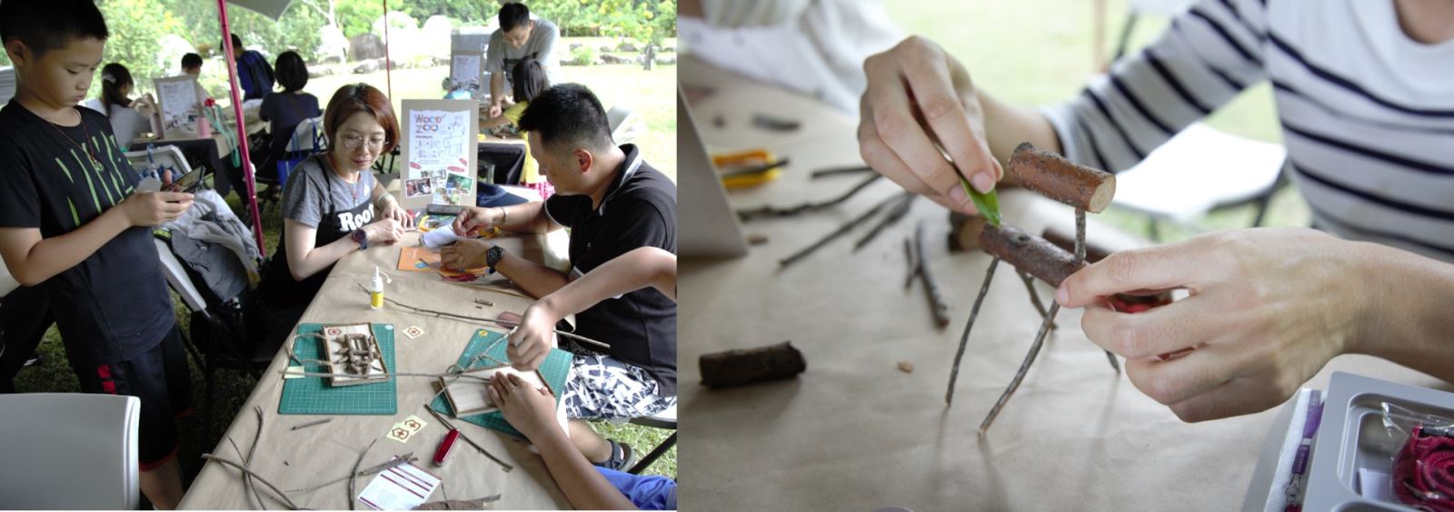 在老師說明後課程進行到最能展現創造力的部分!小朋友在樹林、草叢間穿梭尋找落地的自然素材,心中規畫草稿,準備一展身手創造屬於自己的自然藝術品!而工欲善其事必先利其器,專屬小朋友們的VICTORINOX My first Victorinox 兒童版安全瑞士軍刀更是自然創作中不可或區的工具。在素材準備好之餘,講師黃一峯、黃仕傑老師親身示範,如何以正確手勢操作與如何安全地使用瑞士軍刀功能,親子一同賣力打造出別具巧思與意義的「我的自然門牌」作為本次活動的紀念創作品!