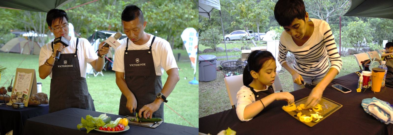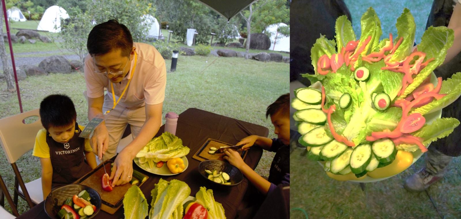 傍晚夕陽西下之時,我們進行了一場「料理食藝秀」。將簡單的沙拉食材化為不平凡的藝術饗宴,使用由VICTORINOX提供的廚刀、砧板,一刀刀切下各式食材當作顏料,在餐盤上揮灑創意。比起孩子們創作,大人們更多了份為家付出的專注,拼湊出一幅美麗又健康的前菜,綠意盎然的戶外環境下,我們一起分享創作理念,也彷彿喚回孩童時期的童心與純真!