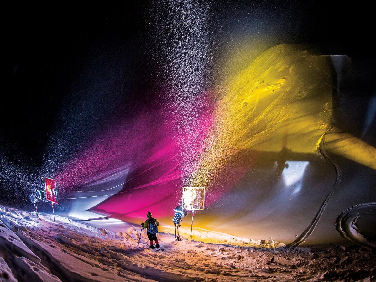在不列顛哥倫比亞的戈爾登附近,穿著雪靴的燈光師在調整燈光。「每次拍攝都要花好幾個小時布置,」攝影師奧斯卡‧恩納德說,「因此我們一定要成功。」Photograph by Oskar Enander