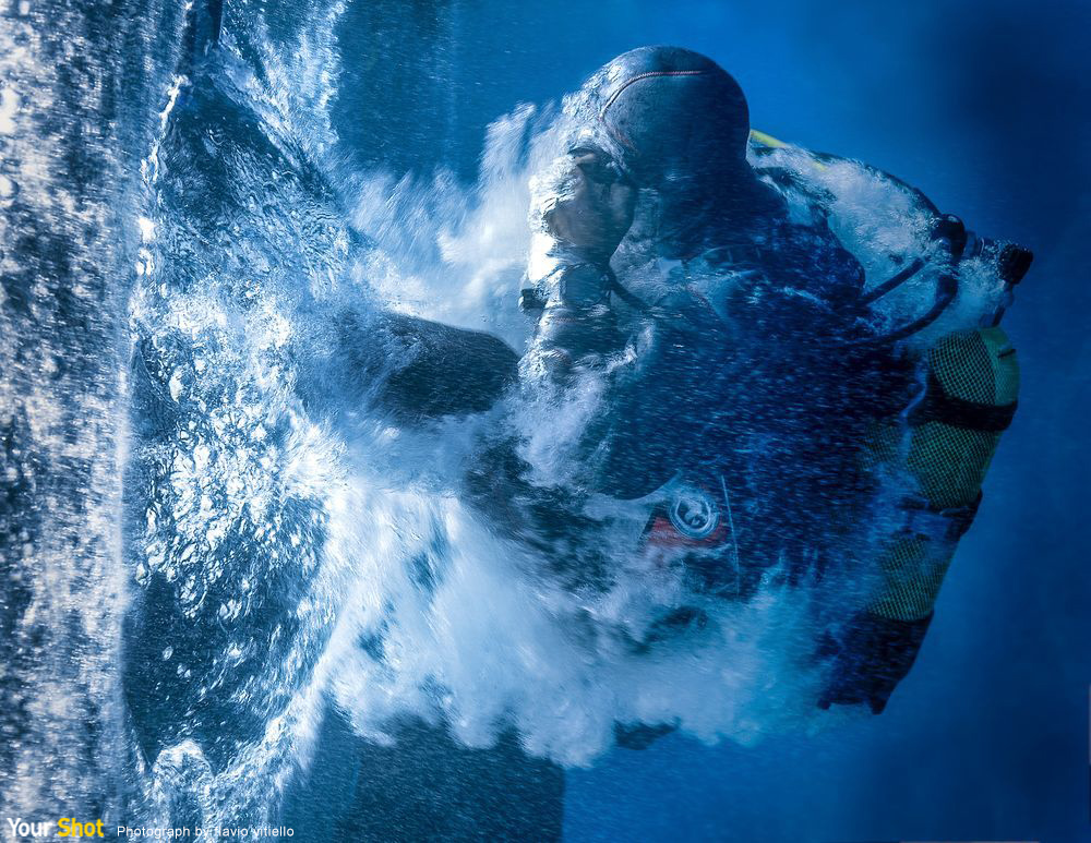 我一整年每個週末都去義大利托斯卡尼沿岸潛水。這是我幾年前在厄爾巴島拍攝的照片,用以表達每一次縱身投入地中海懷抱的那股強烈情感——對於生活在它周圍的人而言,它猶如母親。潛入海中就像回到平靜的羊水中;結束潛水後浮出水面,就像重新誕生於這個充滿聲音與色彩的世界。這張照片可以從左到右或是從右到左看都行。