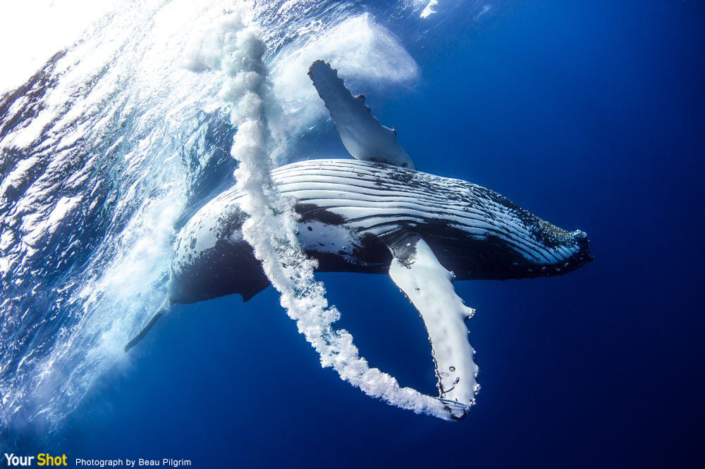 這隻雄座頭鯨花了一個多小時在水中玩耍並在我周圍與我互動,為相機上演了一場令人不可思議的秀。拍攝這張照片的當下,牠的胸鰭正擊破水面,留下了一小串氣泡。