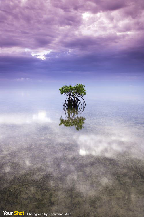 佛州邁阿密比斯坎灣淺水區有一孤單的紅樹。照片中的海草讓前景的質地十分特別,再加上雲霧繚繞與樹木的倒影,饒富趣味。(本作品來自〈你的觀點〉,同時收錄於每日精選App中20161116圖集。)