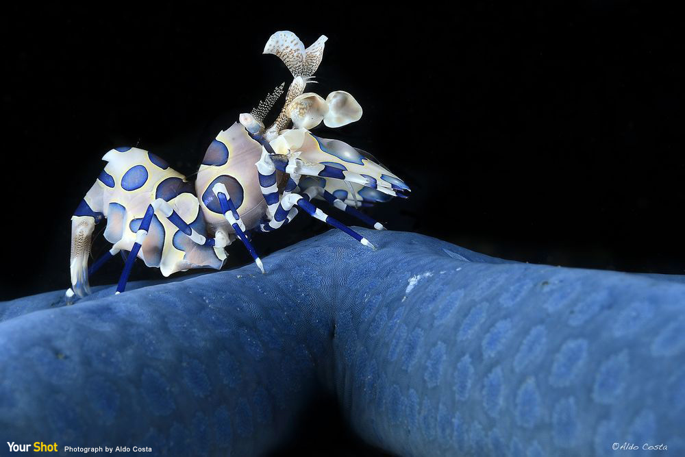 在藍碧(Lembeh)潛水期間,嚮導指出藍色海星上的釉彩臘膜蝦(Harlequin Shrimp)給我看。我對於兩者都是藍色感到驚艷。(本作品來自〈你的觀點〉,同時收錄於每日精選App中20161203圖集。)
