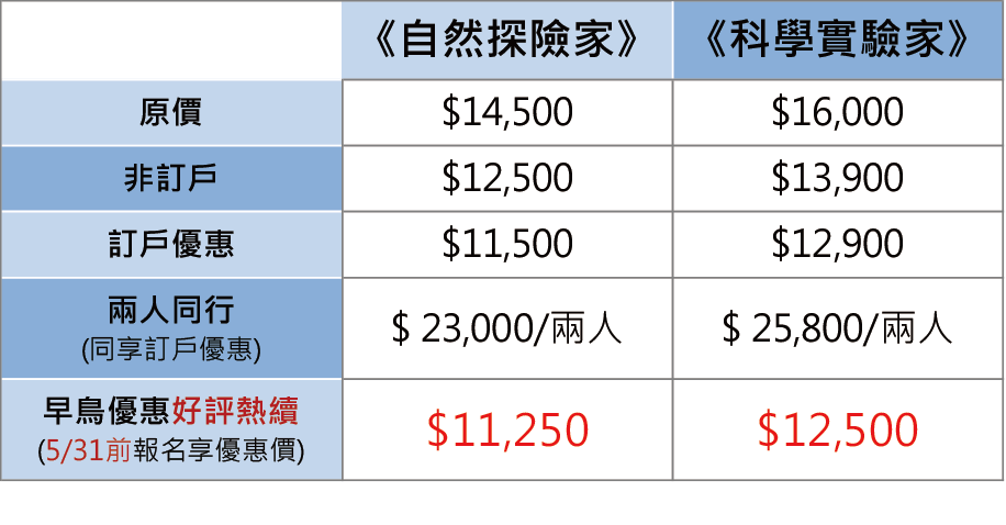 《自然探險家》?訂戶報名優惠、?非訂戶報名優惠、?兩人同行報名優惠