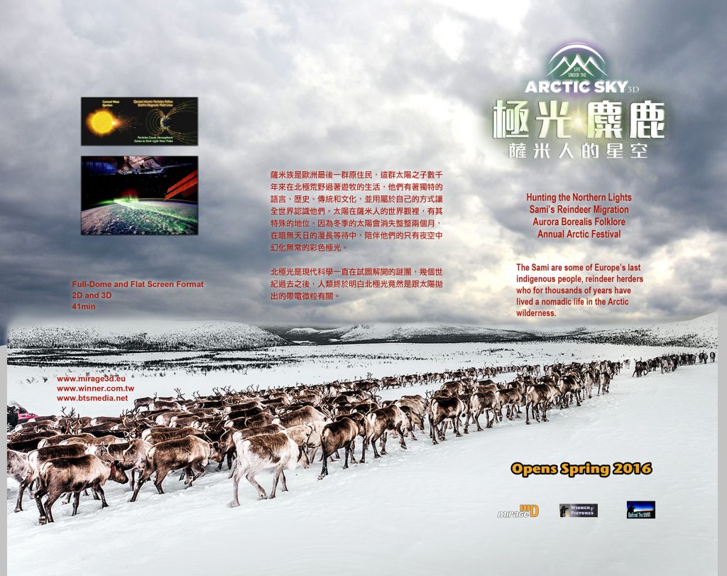 《極光、馴鹿—薩米人的星空》是由臺灣萬通影音公司與荷蘭Mirage 3D團隊合作拍攝,實地在北歐的北極圈內拍攝數年,跟隨著北歐馴養麋鹿的薩米人家族一起遷徙,體驗薩米人的生活與演變。除了介紹北極特殊的環境與薩米人的生活外,還拍攝了極地特有的美麗極光,不可錯過。